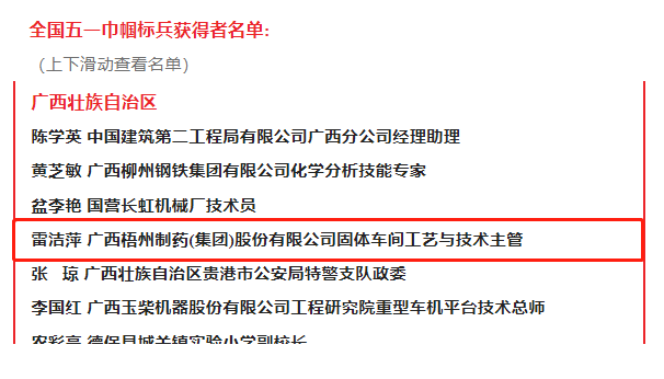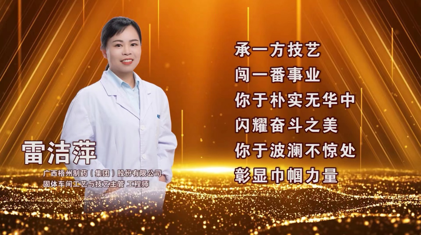 近日,中華全國總工會在北京隆重召開2023年全國五一巾幗獎表彰大會,大會表彰了450個全國五一巾幗標(biāo)兵崗、450名全國五一巾幗標(biāo)兵。梧州制藥固體車間工藝與技術(shù)主管、中華跌打丸制作技藝“非遺”傳承人雷潔萍榮獲“全國五一巾幗標(biāo)兵”稱號。其所在的固體車間于2021年度曾榮獲 “全國巾幗文明崗”榮譽稱號,她們巾幗不讓須眉,立足崗位履職盡責(zé),把智慧和汗水奉獻(xiàn)在崗位,為企業(yè)快速發(fā)展作出了積極貢獻(xiàn),充分發(fā)揮了“半邊天”不可替代的作用。