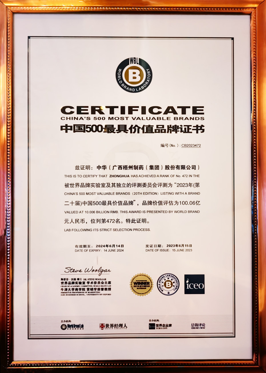 早在2021年,中國(guó)品牌建設(shè)促進(jìn)會(huì)已將“中華”品牌列入“中華老字號(hào)”組50強(qiáng),品牌價(jià)值為70.52億元。2023年,“中華”品牌經(jīng)世界品牌實(shí)驗(yàn)室及其獨(dú)立的評(píng)測(cè)委員會(huì)評(píng)測(cè)認(rèn)證,成功入選2023年(第二十屆)中國(guó)500最具價(jià)值品牌,獲此殊榮,是世界品牌實(shí)驗(yàn)室對(duì)梧州制藥持續(xù)推進(jìn)“中華”品牌建設(shè),實(shí)現(xiàn)品牌價(jià)值不斷提升的充分肯定。同時(shí),彰顯了公司穩(wěn)健的發(fā)展態(tài)勢(shì)和強(qiáng)勁的品牌實(shí)力。