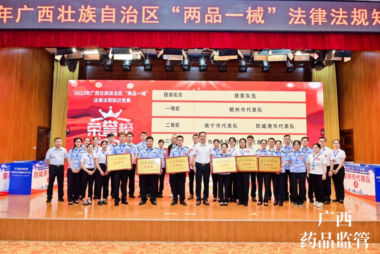 7月13日,由梧州制藥員工代表——質(zhì)量控制部呂金慧、質(zhì)量保證部李佳霖與梧州市場監(jiān)督管理局監(jiān)管人員組成的梧州市代表隊參加廣西壯族自治區(qū)“兩品一械”法律法規(guī)知識競賽,憑借過硬的專業(yè)知識、迅速的反應(yīng)能力、高效的團隊配合力,與全區(qū)14個市代表隊展開激烈角逐,榮獲得2023年廣西壯族自治區(qū)“兩品一械”法律法規(guī)知識競賽一等獎。