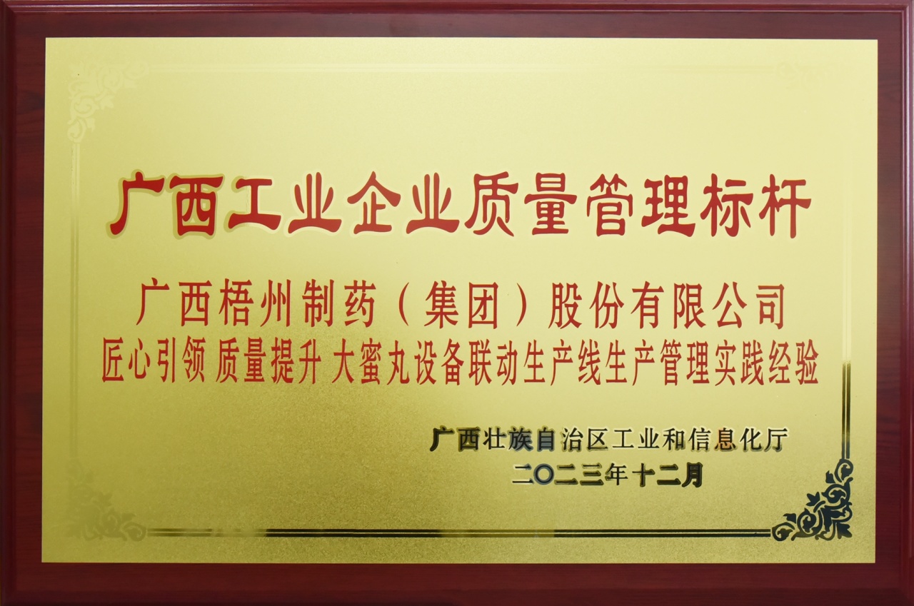 梧州制藥生產(chǎn)管理實(shí)踐案例《匠心引領(lǐng)、質(zhì)量提升 大蜜丸設(shè)備聯(lián)動(dòng)生產(chǎn)線生產(chǎn)管理實(shí)踐經(jīng)驗(yàn)》被授予“廣西工業(yè)企業(yè)質(zhì)量管理標(biāo)桿”榮譽(yù),這是梧州制藥第四次獲評(píng)此榮譽(yù)稱號(hào)。同時(shí),梧州制藥再次獲廣西質(zhì)量協(xié)會(huì)授予“廣西質(zhì)量管理先進(jìn)單位”稱號(hào)。