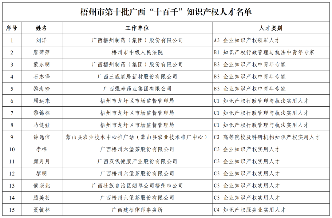 近日,自治區(qū)市場監(jiān)管局公布第十批廣西“十百千”知識(shí)產(chǎn)權(quán)人才名單,廣西梧州制藥(集團(tuán))股份有限公司副董事長、總經(jīng)理劉洋同志獲“A3企業(yè)知識(shí)領(lǐng)軍人才”稱號(hào),藥學(xué)事務(wù)部知識(shí)產(chǎn)權(quán)專員蒙永明同志獲“B3 企業(yè)知識(shí)產(chǎn)權(quán)中青年專家”稱號(hào)。