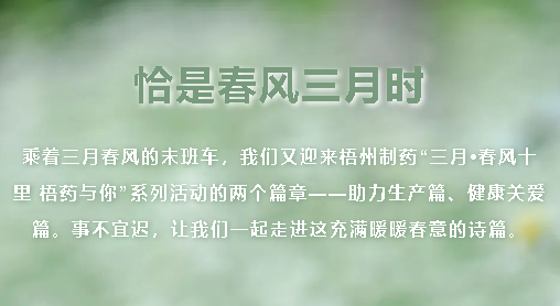 恰是春風(fēng)三月時(shí)乘著三月春風(fēng)的末班車(chē),我們又迎來(lái)梧州制藥“三月?春風(fēng)十里 梧藥與你”系列活動(dòng)的兩個(gè)篇章——助力生產(chǎn)篇、健康關(guān)愛(ài)篇。事不宜遲,讓我們一起走進(jìn)這充滿(mǎn)暖暖春意的詩(shī)篇?!局ιa(chǎn)篇】凝聚“志愿紅”協(xié)力助