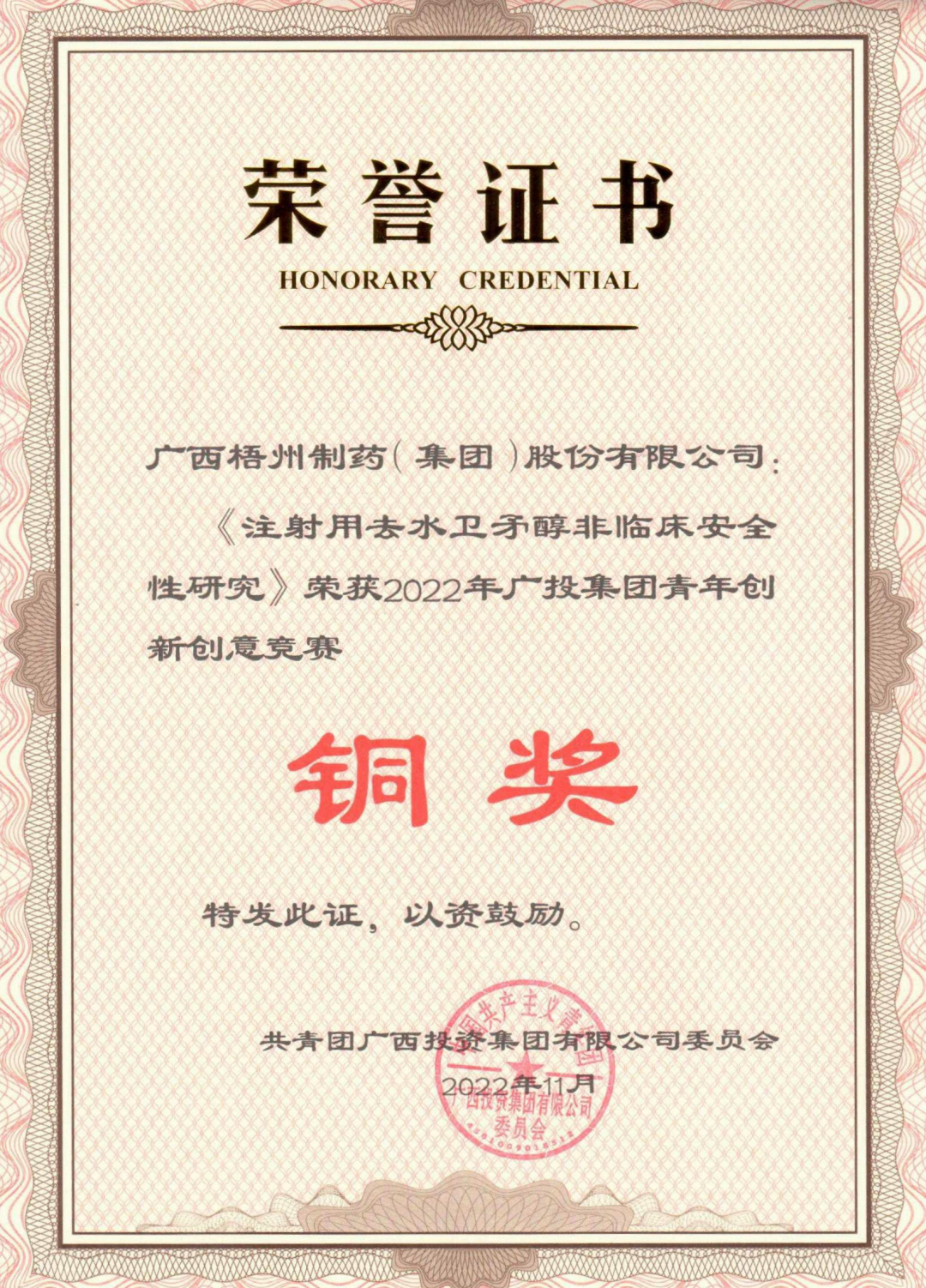 近日,由梧州制藥質(zhì)量保證部組成的梧州制藥代表隊——“質(zhì)量衛(wèi)士”隊,憑借項(xiàng)目《注射用去水衛(wèi)矛醇非臨床安全性研究》獲得2022年廣投集團(tuán)青年創(chuàng)新創(chuàng)意競賽銅獎的表彰。本次競賽共有16個項(xiàng)目最終入圍決賽,通過視頻會議的